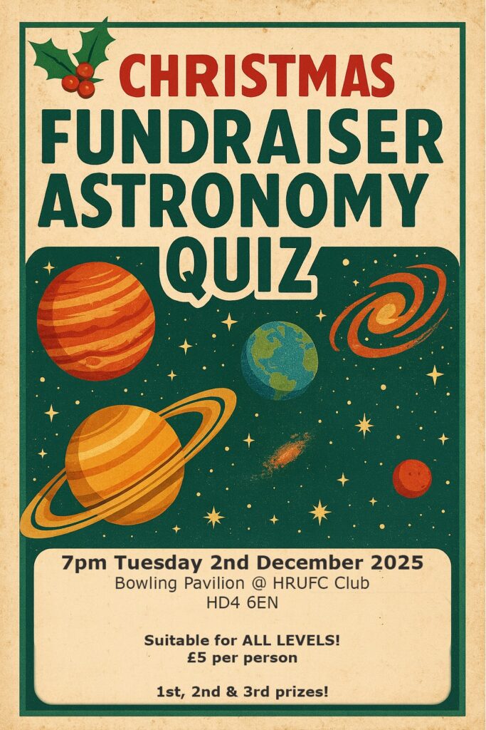 Huddersfield Astronomy Society is a non-profit charity. All proceeds from the quiz help us keep our amazing club running for the people of Huddersfield and surrounding areas to enjoy. Your support helps us keep hosting public outreach events, courses and public lectures and allows us to keep teaching you about the night sky and everything in it! The club needs your support.